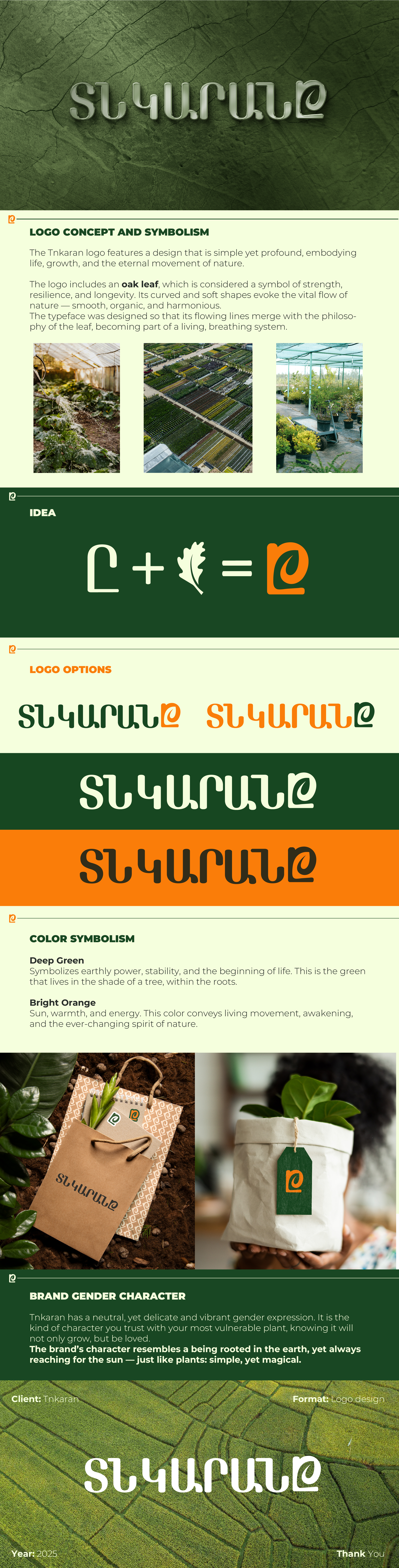 The Tnkaran logo features a design that is simple yet profound, embodying life, growth, and the eternal movement of nature. The logo includes an oak leaf, which is considered a symbol of strength, resilience, and longevity. Its curved and soft shapes evoke the vital flow of nature smooth, organic, and harmonious. The typeface was designed so that its flowing lines merge with the philoso- phy of the leaf, becoming part of a living, breathing system.